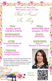 Please join the Women of Worship for their Third Annual Tea Party on Saturday, April 25th, from 2:00 to 4:00 pm at the Family Life Center. Our special guest speaker, Spring Rutland from SBTC Women's Ministry, is passionate about encouraging widows, supporting those in ministry, blended families, and single moms facing challenges. The cost is $10, which includes delicious desserts, tea, and coffee. Prizes will be awarded for the best hat and best outfit, along with exciting door prizes. Tea party attire is encouraged but not required.